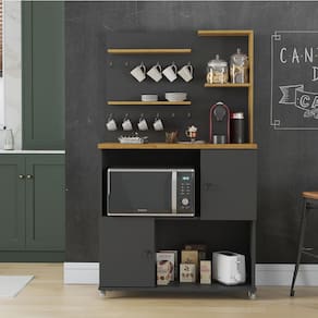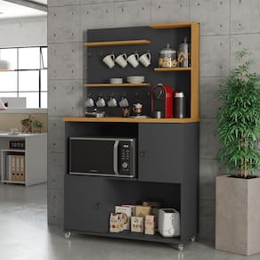 Especificações:Tampo de 25 mmGanchos para 12 xícarasPrateleirasPuxadores de metalNicho para micro-ondasRodízios de silicone com trava Dimensão do produto:Altura 1575 mmLargura 900 mmProfundidade 450 mm
