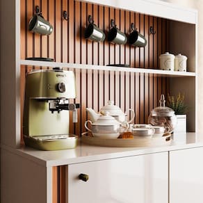 Cantinho do Café Dolce Movelove - é ideal para sua Cozinha! Com designer Retrô ele irá agregar muito mais charme e requinte ao seu ambiente. Possui o Efeito Ripado em freijó, com 2 portas, gancho de ferro e prateleiras para amazenamento. Amplo tampo para acomodar seus objetos de decoração, xícaras etc. Elaborado em MDF usinado com pés em madeira maciça, esses atributos garantem ao produto maior resistência e durabilidade.