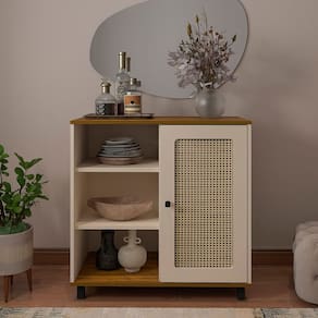 Buffet Charlotte: versatilidade e design único. Com detalhes em palhinha e cores harmoniosas, é ideal para armazenar louças, talheres e decorativos. Adapta-se a diversos espaços, elevando a estética e funcionalidade da sua casa.