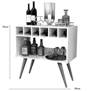 O Aparador Lorenzo é um produto prático e sofisticado,ideal para decorar aquele cantinho da sua casa. -Tampo em MDP; -Prateleira; -Adegas para até 6 garrafas; -Pés chanfrado em madeira maciça; –Pintura ultravioleta com acabamento brilho; -Detalhe retrô para dar aquele toque especial no produto. *Dimensões do Produto Montado:-Altura: 75cm-Largura: 70cm-Profundidade: 34cm *Adega: -Altura: 10cm -Largura: 10cm -Profundidade: 30cm