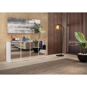 O Aparador Buffet 4 Portas com Espelho Vegas Multimóveis é produzido em MDP, que garante maior durabilidade, facilidade na limpeza, além de um acabamento superior. Com 4 portas, possui acabamento acetinado (cerca de 20% de brilho) e um excelente espaço interno para organizar seus pertences (as prateleiras internas suportam 5 Kg cada e o tampo 10 Kg). Os detalhes com espelhos nas portas deixam o móvel mais requintado, criando um ambiente moderno e charmoso. Os espelhos são de vidro (o que evita que a imagem fique distorcida) e lapidados, ou seja, passam por um processo para que as bordas não fiquem cortantes, o que garante maior . Seu design minimalista, torna o móvel muito versátil, podendo ser utilizado de diversas maneiras e em qualquer ambiente.