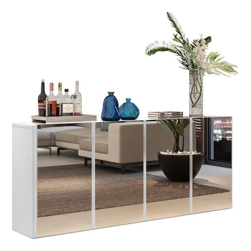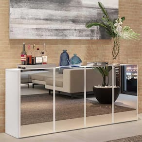 O Aparador Buffet 4 Portas com Espelho Vegas Multimóveis é produzido em MDP, que garante maior durabilidade, facilidade na limpeza, além de um acabamento superior. Com 4 portas, possui acabamento acetinado (cerca de 20% de brilho) e um excelente espaço interno para organizar seus pertences (as prateleiras internas suportam 5 Kg cada e o tampo 10 Kg). Os detalhes com espelhos nas portas deixam o móvel mais requintado, criando um ambiente moderno e charmoso. Os espelhos são de vidro (o que evita que a imagem fique distorcida) e lapidados, ou seja, passam por um processo para que as bordas não fiquem cortantes, o que garante maior segurança. Seu design minimalista, torna o móvel muito versátil, podendo ser utilizado de diversas maneiras e em qualquer ambiente.