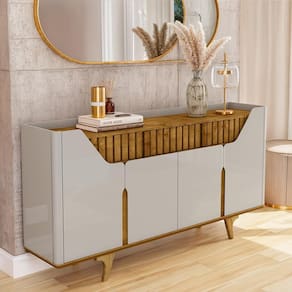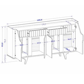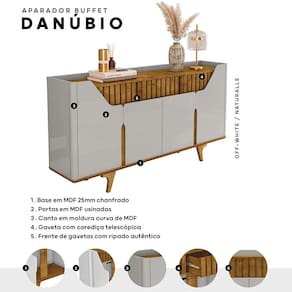 O Aparador Danúbio é o móvel que sua casa precisa! Ele possui design moderno que mescla suas curvas nas portas e laterais com detalhe em ripado real. Ele conta com Base em MDF de 25mm chanfrada em ângulo, portas em MDF chanfrada com design único que proporciona ao produto beleza charme e requinte como nenhum outro entrega! Cantos curvos feitos em MDF, amplo tampo e prateleira ajustável. Gavetas com corrediças telescópicas, sendo as frentes em ripado real. Pés em madeira maciça que garantem ainda mais resistência e qualidade ao produto.