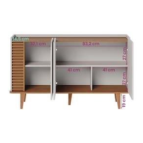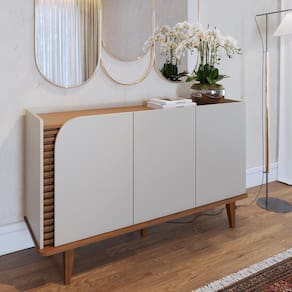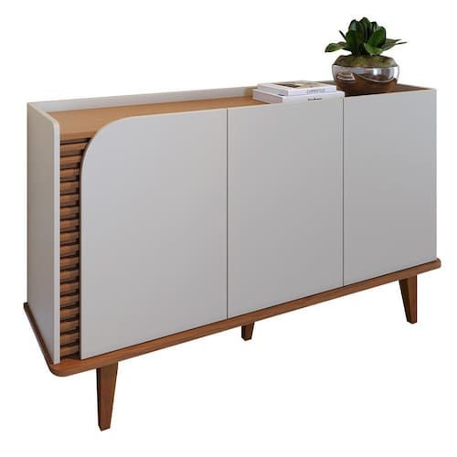 Deslumbre-se com o Buffet Jurerê, uma fusão perfeita de design retrô e contemporâneo, evidenciado pelos seus pés de madeira maciça e linhas orgânicas. Destaca-se pelos apliques ripados com 20mm de profundidade, realçados pela porta de quina usinada.