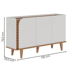 O tampo amadeirado, elegantemente recuado, proporciona a sensação de uma bandeja, definindo o caráter único deste buffet. Sua base com quinas arredondadas adiciona um toque suave à estrutura. Com 03 portas, o interior revela prateleiras reforçadas, perfeitas para a organização de louças.
