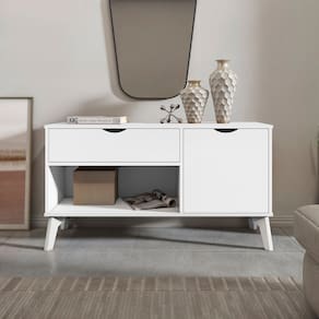 Estrutura: MDPAcabamento: Pintura U.V., alta resistência, que assegura durabilidade e beleza ao acabamentoGaveta: Sim, com corrediças telescópicasPorta: Sim, com dobradiças metálicasNicho: Sim, abaixo da gavetaPés: Sim, estilo reto palito, em madeira maciçaDimensões do produto montado
