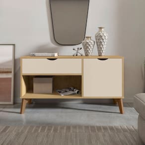 Estrutura: MDPAcabamento: Pintura U.V., alta resistência, que assegura durabilidade e beleza ao acabamentoGaveta: Sim, com corrediças telescópicasPorta: Sim, com dobradiças metálicasNicho: Sim, abaixo da gavetaPés: Sim, estilo reto palito, em madeira maciçaDimensões do produto montado