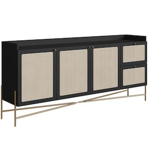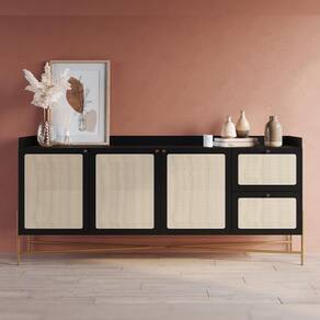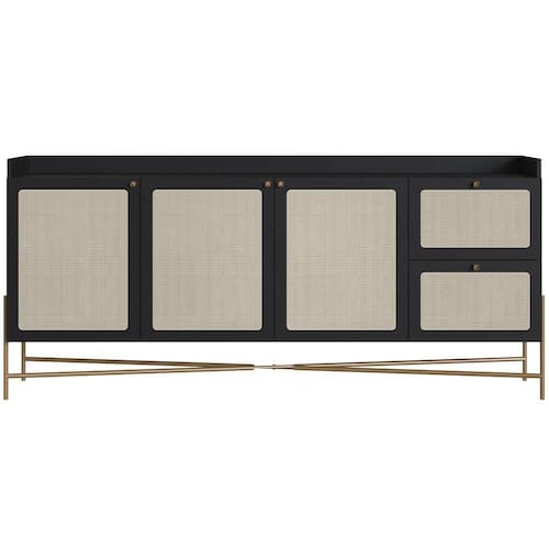 Renove a sua sala de jantar ou sala de estar com o elegante Aparador Buffet 183cm Indy, da Lyam Decor! Com design sofisticado, esse balcão buffet conta com 3 portas e 2 gavetas, oferecendo amplo espaço para organizar seus utensílios e adornos. Os pés metálicos estilo industrial garantem a robustez e a durabilidade que você procura, enquanto o charmoso detalhe em tela sintética adiciona um toque artesanal e suave ao móvel.