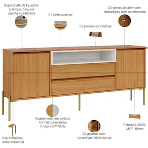 Seu design harmonioso une organização e estilo, oferecendo espaços inteligentes para tudo o que você precisa guardar ou exibir. Esse balcão buffet conta com portas que abrem para um amplo armazenamento, gavetas que deslizam suavemente para guardar talheres e utensílios, e um nicho aberto perfeito para suas peças decorativas favoritas - aquele toque pessoal que transforma uma casa em lar. Já a tonalidade adiciona calor e modernidade, enquanto o tampo generoso se torna o palco para seus jantares especiais ou momentos de café da manhã com estilo.