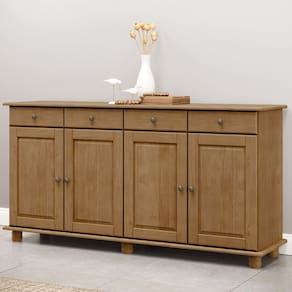 A começar pelo amplo espaço de armazenamento, com divisões internas inteligentes para organizar louças, cristais e mantimentos; gavetas práticas com sistema de deslize suave para talheres, toalhas e utensílios de mesa, além dos pés torneados e puxadores envelhecidos que contam histórias de tradição, enquanto possui acabamento perfeito para ambientes que exigem durabilidade e personalidade. Seja para cozinha de fazenda ou para uma cozinha rústica urbana, esse balcão buffet é a escolha certa.