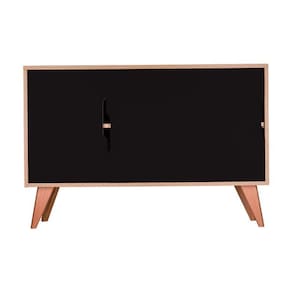 Possui dois compartimentos internos divididos por uma prateleira e 3 portas cor Preto, conjunto apoiado em lindos pés torneados em madeira maciça.
