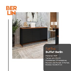 Aparador ou Buffet? Você que escolhe qual a melhor maneira para usar nosso Berlim, desenvolvido com exclusividade pela ViaNossa com a mais alta qualidade, com a estrutura em material MDP, pintura UV e tampo em 25 mm, conta com 3 prateleiras internas com excelente espaço para organização, 3 portas articuladas com dobradiças metálicas, puxadores em ABS e pés ripados em MDP com sapatas plásticas.