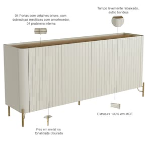 Fabricado em 100% MDF, esse buffet combina portas lisas e um design curvo - características do estilo orgânico - com pés metálicos industriais, criando um visual único e cheio de personalidade. Já com o tampo levemente rebaixado no estilo bandeja, esse aparador elegante oferece um espaço prático para exibir objetos decorativos ou servir drinks em encontros especiais. Além disso, o detalhe da porta Brise realça a beleza, ao passo que cria um efeito de textura ao balcão buffet. Por fim, seu amplo espaço interno garante organização sem comprometer a elegância, perfeito para guardar louças, toalhas ou itens de decoração.
