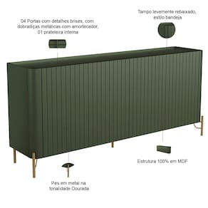 Linha: Sala de Jantar, Orgânica, Industrial | Com corrediças: Não | Com alça: Não | Peso máximo suportado da prateleira: 5 kg | Altura: 81 cm | ColorSimple: Verde | Model: Naim | Material: MDF | MaterialFamily: MDF | Color: Verde | Fabricante: Lyam Decor | Cor: MusgoDourado | Largura: 180 cm | ColorFamily: Verde | ColorSupplier: MusgoDourado | Profundidade: 40 cm | ProductWidth: 180 cm | SupplierSimpleName: Aparador Buffet Sala de Jantar 4 Portas Brise Pés Industrial Dourado Naim I03 Musgo - Lyam Decor | OriginState: PR | OriginCountry: Brasil | Quantidade de prateleiras: 1 | ProductLength: 40 cm | SizeDescription: Altura: 81 cm x Largura: 180 cm x Profundidade: 40 cm | ProductContents: 01 Balcão Buffet | Quantidade de portas: 4 | ProductWeight: 43 kg | Com rodas: Não | ProductHeight: 81 cm | ProductWarranty: 90 dias após o recebimento do produto | ProductInstructions: Produto para uso em ambiente interno, nao devendo ficar exposto ao sol, calor e umidade excessivos. | Requer montagem: Sim