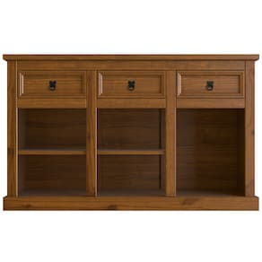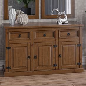 Eleve o nível da sua sala de jantar com o Aparador Buffet Majestic!Uma peça de grande capacidade, com 3 portas de design almofada em alto-relevo, 3 gavetas e prateleira interna você poderá organizar louças, talheres, toalhas e itens de mesa posta com uma eficiência nunca vista. Além disso, a combinação do ferro fundido nos puxadores com a madeira maciça cria um móvel incrivelmente resistente e estiloso, ideal para quem não abre mão de praticidade e um visual rústico e aconchegante. Tenha tudo à mão para suas refeições especiais e garanta momentos Majestic!