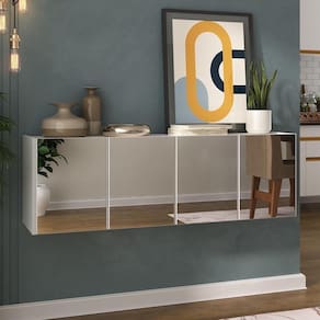 O Aparador Buffet Suspenso com Espelhos 4 Portas Multimóveis MP8005 é perfeito para você que busca praticidade e estilo na sala de jantar. Com um design clean, este aparador possui um visual moderno e elegante que vai complementar a decoração da sua casa. Ele é produzido em MDP com acabamento acetinado (cerca de 20% de brilho), o que garante durabilidade e resistência ao móvel. Além disso, suas 4 portas oferecem amplo espaço interno para você organizar seus objetos de forma prática. Por ser suspenso, otimiza os espaços e facilita a limpeza do ambiente. Suporta até 6kg em cada prateleira e 10kg no tampo. Os espelhos são de vidro, evitando que a imagem fique distorcida, e lapidados (passam por um processo para que as bordas não fiquem cortantes), garantindo maior segurança e deixando o móvel mais requintado.