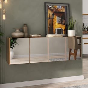 O Aparador Buffet Suspenso com Espelhos 4 Portas Multimóveis MP8005 é perfeito para você que busca praticidade e estilo na sala de jantar. Com um design clean, este aparador possui um visual moderno e elegante que vai complementar a decoração da sua casa. Ele é produzido em MDP com acabamento acetinado (cerca de 20% de brilho), o que garante durabilidade e resistência ao móvel. Além disso, suas 4 portas oferecem amplo espaço interno para você organizar seus objetos de forma prática. Por ser suspenso, otimiza os espaços e facilita a limpeza do ambiente. Suporta até 6kg em cada prateleira e 10kg no tampo. Os espelhos são de vidro, evitando que a imagem fique distorcida, e lapidados (passam por um processo para que as bordas não fiquem cortantes), garantindo maior segurança e deixando o móvel mais requintado.
