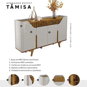 O Aparador Tâmisa é o móvel perfeito para sua casa! Ele possui design moderno que mescla suas curvas nas portas e laterais com detalhe em ripado real. Ele conta com Base em MDF de 25mm chanfrada em ângulo, portas em MDF chanfrada com design único que proporciona ao produto beleza inigualável. Cantos curvos feitos em MDF, amplo tampo e prateleira ajustável. Pés em madeira maciça que garantem ainda mais resistência e qualidade ao produto.