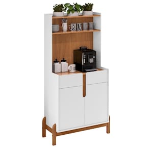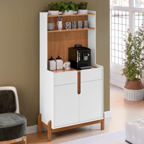 Aparador Cantinho Café 2 Portas 2 Gavetas com Pés de Madeira Lizz Casa D, é ideal para sua Cozinha! Com designer Retrô ele irá agregar muito mais charme e requinte ao seu ambiente. Possui amplo tampo para acomodar objetos de decoração, xícaras, entre outros. As duas portas contém dobradiças de 35mm e sistema soft-close. Elaborado em MDF e MDP usinado com pés em madeira maciça, esses atributos garantem ao produto maior resistência e durabilidade.