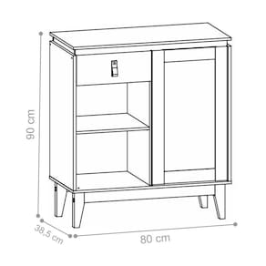 O aparador possui um puxador de alça de Material Sintético, dobradiças Metálicas de 26mm e pés de madeira maciça com feltro .