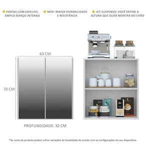 O Aparador Cantinho do Café com Espelho Suspenso 2 Portas Multimóveis é produzido em MDP com acabamento acetinado (cerca de 20% de brilho), que garante maior durabilidade, facilidade na limpeza, além de um acabamento superior. Com 2 portas, possui um excelente espaço interno para organizar louças, bebidas e demais objetos (a prateleira interna suporta 8 Kg e o tampo 9 Kg) e ainda acompanha kit para ser montado de forma suspensa, conforme a altura que você quiser do chão. Os detalhes com espelhos nas portas deixam o móvel mais requintado, criando um ambiente moderno e charmoso. Os espelhos são de vidro (o que evita que a imagem fique distorcida) e lapidados, ou seja, passam por um processo para que as bordas não fiquem cortantes, o que garante maior segurança. Os amantes de café poderão deixar seu cantinho mais prático e aconchegante para curtir os melhores momentos com os amigos e família, saboreando um delicioso cafezinho.