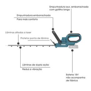 Dados técnicos Voltagem bateria: 18v; Rotação: 2450cpm Comprimento de sabre: 55 cm; Espaçamento de corte: 20 mm; Distância entre dentes: 2cm; Peso: 2,3kg