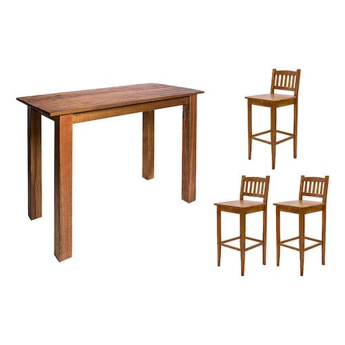 Conjunto rústico em madeira maciça, composto por balcão para bar e banquetas, ideal para criar um ambiente charmoso e aconchegante. Robusto e elegante, combina funcionalidade e estilo para espaços gourmet, áreas de lazer ou decoração sofisticada.