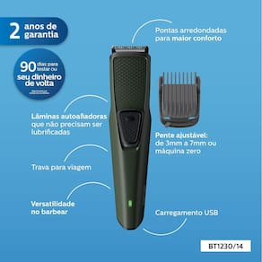 As lâminas em aço inoxidável são auto afiadoras e não irritam a pele. A luz no dispositivo indica quando a bateria está sendo carregada. Possui um pente aparador de 3 a 7 mm, cabo USB e trava para viagem, e ainda conta com 2 anos de garantia.