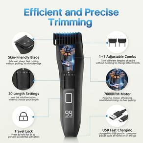 Este é um aparador de barba masculino premium e também um cortador de cabelo sem fio, 20 rodas de lâmina ajustáveis de 0,5 mm a 10 mm, lâmina em forma de T pode aparar precisamente pelos faciais e pelos corporais. É à prova d'água com classificação IPX7 e tem uma bateria de alto desempenho que oferece até 60 minutos de uso, a navalha de barba sem fio pode ser carregada por cortador USB sem fio à prova d'água e molhado/seco adequado para todos os homens, a melhor surpresa apresenta para huss. banda, namorado, pai