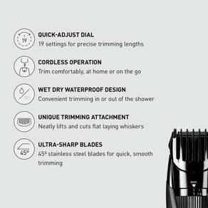 - Corte e escultura personalizados: um mostrador ajustável com 19 configurações para obter a aparência exata desejada; o acessório de pente incluído levanta os cabelos achatados para um corte limpo.