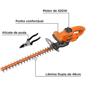 - Potência 420W; - Velocidade 1960 RPM; - Capacidade de corte 5/8 (16mm); - Tamanho da lâmina 18 (450mm); - Espaço entre os dentes de 16mm; - Peso:2.47 kg; - Punho auxiliar em forma de D para maior comodidade e controle; - Acompanha: 1 Alicate manual para poda e 1 Manual de instruções.
