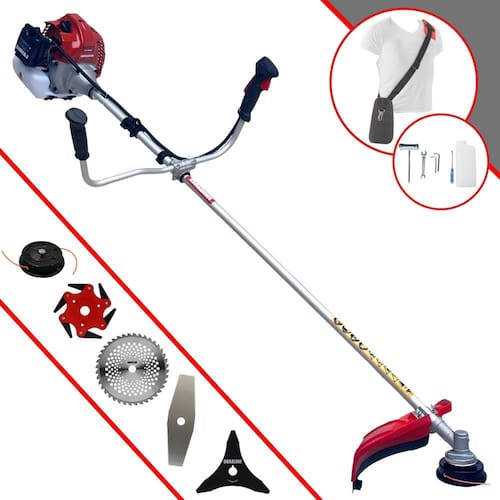 Com guidão ergonômico lateral, permite um alcance amplo e maior mobilidade, capaz de aumentar a produtividade diária. Possui motor 2 tempos á gasolina, de 52 Cilindradas; 2,5HP de potência que proporcionam maior performance e economia na operação. Seu conjunto de acessórios inclui kit de ferramentas, cinto de suporte almofadado, carretel de nylon e lâmina de corte 3 pontas.