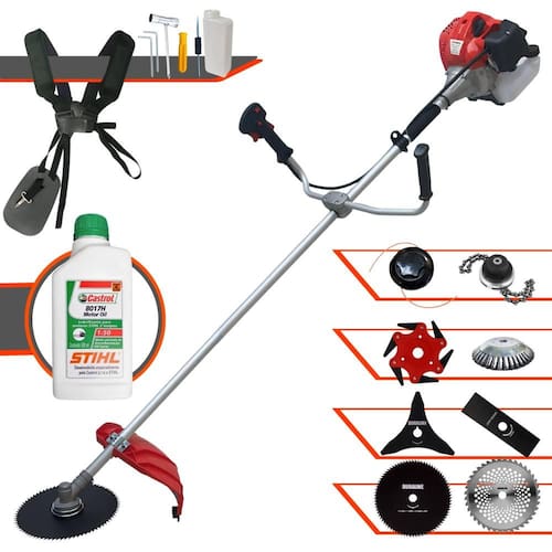 Roçadeira Lateral ANMAX CG430P À Gasolina 2 Tempos 43cc 2HP + Faca 3 Pontas 255m + Faca 40 Dentes 255mm + Faca 80 Dentes 255mm + Trimmer + Escova Rotativa 38 cerdas + Faca 6 Pontas + Óleo Castrol Stihl 500ml