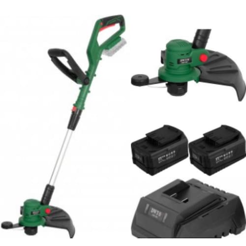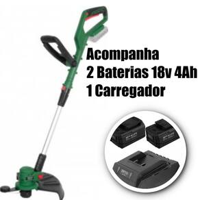 1 Aparador de grama. Acompanha: 1 carretel com 3 m de fio de nylon de 1,6 mm + 2 Baterias 18V lítio 4 Ah IBD 1802 DWT linha intercambiável + 1 Carregador de bateria 18V ICBD 1805 DWT linha intercambiável
