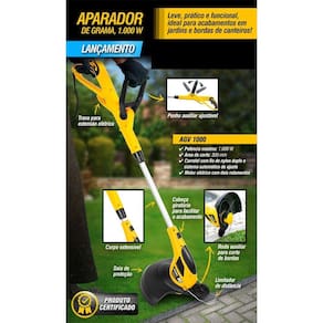 Leve, prático e funcional, possui punho auxiliar ajustável, corpo extensível, motor elétrico com dois rolamentos, trava que não deixa a extensão elétrica desconectar, carretel com saída dupla para o fio, sistema de avanço manual e corte automático do fio de nylon. Possui ainda, roda auxiliar de apoio para cortar as bordas da grama e cabeça com possibilidade de rotação, podendo ser posicionada na vertical ou horizontal, proporcionando maior facilidade nos acabamentos, além de limitador de distância que evita que o fio de nylon danifique o tronco ou o caule das plantas.