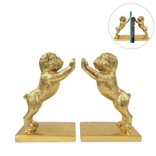 Design Elegante: Com um acabamento dourado deslumbrante, este aparador de livro apresenta um adorável cachorro, combinando charme e sofisticação em uma única peça. Materiais de Alta Qualidade: Feito com materiais duráveis, este aparador de livro garante longevidade e resistência, mantendo sua beleza intacta por muitos anos.