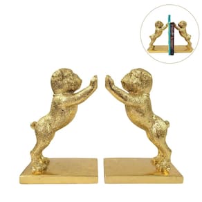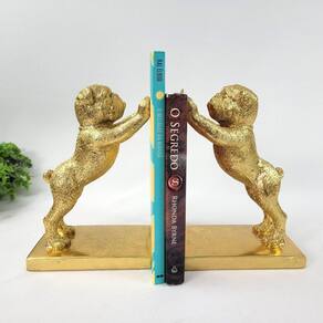 Design Elegante: Com um acabamento dourado deslumbrante, este aparador de livro apresenta um adorável cachorro, combinando charme e sofisticação em uma única peça.