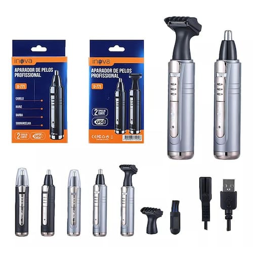 Aparador de Pelo Inova Barba Nariz 2 em 1 Profissional U771 Remova com segurança e conforto os pelos indesejados do nariz e das orelhas com facilidade usando nosso Aparelho Aparador de Pelos Elétrico e Portátil. Oferecendo uma solução rápida e fácil, suas lâminas giratórias com proteção metálica garantem um acabamento preciso, sem cortes ou arranhões. Principais características: Remoção eficiente de pelos indesejados: Alcance e remova facilmente os pelos do nariz e das orelhas de forma eficiente. Certifique-se de que as narinas estejam limpas antes de usar e insira o aparador cuidadosamente no interior do nariz, a uma profundidade máxima de 0,5 cm, fazendo movimentos circulares lentos. Para os pelos das orelhas, verifique se não há cera presente. Ao aparar as sobrancelhas, utilize uma pressão leve, movendo-se na direção oposta ao crescimento dos pelos, para um corte uniforme até o comprimento desejado. Totalmente lavável e fácil de limpar: O aparador é à prova d'água e pode ser facilmente limpo em água corrente após cada uso, garantindo higiene e praticidade. Seguro e não irritante para a pele: Desenvolvido para proporcionar um uso seguro e sem irritações. Suas lâminas são projetadas para evitar cortes ou machucados durante o processo de remoção de pelos. Leve e portátil: Com um design leve e compacto, o aparador é fácil de transportar, permitindo que você o leve para onde quiser, seja em viagens ou no dia a dia. Barba sempre bem-feita: Além da remoção de pelos do nariz e das orelhas, este aparador também é ideal para manter sua barba sempre bem-cuidada, oferecendo versatilidade em seu uso. Recarregável: Com sua funcionalidade recarregável, você pode utilizar o aparador sem se preocupar com a frequente de pilhas. Ideal para uso em: Cabelo,Nariz,Barba,Sobrancelha Conteúdo da embalagem: 1 Aparelho Aparador de Pelos Elétrico e Portátil 1 Trimmer / Pente de Altura 1 Cabeçote para aparar pelos do nariz e orelha 1 Escova de limpeza 1 Cabo USB 1 Manual de Instruções
