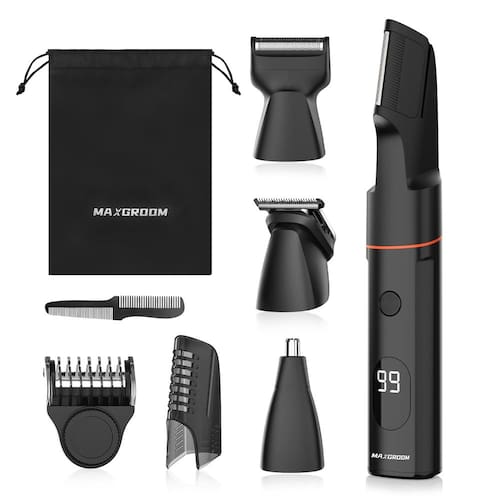 bola elétrica de paisagismo paisagístico masculino virilha de corpo inteiro kit aparador de pelos pubianos masculino barbeador de pelos pubianos masculinos -?Kit multifuncional de tratamento corporal?O conjunto de aparador de pelos corporais masculino MAXGROOM inclui 4 cabeças de corte diferentes: cabeça de aparador de corpo em forma de V, cabeça de aparador de barba, cabeça de microbarbeador e cabeça de aparador de nariz, todas são removíveis e intercambiáveis para aparar da cabeça até os pés, atendendo perfeitamente a todas as suas necessidades diárias de higiene com facilidade. -?Suave para peles e áreas sensíveis?As lâminas do aparador são feitas de material hipoalergênico de aço inoxidável, ajudando a minimizar a irritação mesmo em peles sensíveis; além disso, as lâminas em forma de R com ponta redonda cortam suavemente os pelos nas áreas delicadas, como axilas, peito, virilha e púbis. -?Cabeça cortadora exclusiva em forma de V?O aparador de pelos corporais masculino MAXGROOM adota uma cabeça inovadora em forma de V, que pode ser cortada suavemente em áreas estreitas e de difícil acesso, como costas, axilas, virilha, púbis e nádegas. O dispositivo em forma de I com design ergonômico é muito confortável de segurar, proporcionando um controle total de sua rotina diária de corte. -?Comprimentos de corte ajustáveis?Este aparador de barba vem com um pente ajustável para aparar a barba, basta girar o botão no pente para alterar as configurações de comprimento de 1 mm para 9 mm, permitindo que você crie com precisão diferentes formas de barba. -?Impermeável para uso úmido e seco?Todo o corpo deste aparador de pelos corporais adota material impermeável, atingindo o nível IPX6. Você pode desfrutar livremente de cuidados úmidos e secos dentro ou fora do chuveiro; o aparador corporal também é lavável e pode ser enxaguado em água corrente para facilitar a limpeza. -?Bateria de longa duração com display LED?Nosso aparador de pelos pubianos recarregável é alimentado por uma bateria de íon de lítio de grande capacidade, fornecendo 90 minutos de uso sem fio após 1,5 horas de carga total. O display LED inteligente mostra a energia restante da bateria em tempo real e lembra você de carregar a tempo.