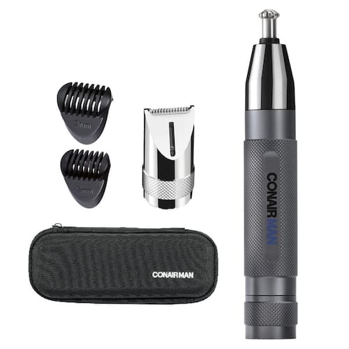- Para homens - Aparador de pelos e sobrancelhas para nariz/orelhas: garanta uma aparência limpa com o mais novo aparador de nariz, orelhas e sobrancelhas da ConAirman. O conjunto inclui: estojo de armazenamento e aparador de sobrancelhas com 2 pentes guia, lâmina avançada de 3 chanfros e cabo de metal profissional.