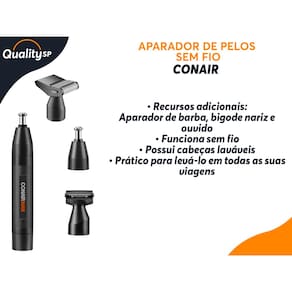 Ficha Técnica: • Marca: Conair • Linha: ConairMAN • Modelo: Aparador de Orelha e Nariz com lâmina 360° • Tipo de uso: Aparador facial (nariz e orelha) • Alimentação: 1 pilha AA (não inclusa) • Tipo de lâmina: - Chanfrada de 360° (pendente de patente) - 3 chanfros em forma de diamante - Corta de vários ângulos (superior, médio e inferior) • Material da lâmina: Aço inoxidável • Design: Compacto, portátil e ergonômico • Cor: Preto • Uso a seco: Sim • Cabeça lavável: Sim, removível e lavável com água corrente • Peso aproximado: 0,108 g • Garantia: 12 meses (fabricante)