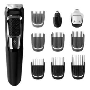 Contém: Multigroom 3000 Lâmina de corte de metal completo Lâmina completa de metal Aparador de pêlos de nariz e orelha 3 protetores de corte de cabelo 3 barreiras para aparar barba Guarda de restolho Saco de armazenamento Escova de limpeza