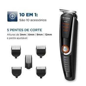Itens inclusos - 01 Aparador de Pelos Completo; 04 Cabeças Aparadoras; 04 Pentes de Corte; 01 Base Carregadora; 01 Pente Ajustável; 01 Óleo Lubrificante; 01 Carregador e 01 Manual de Instruções.