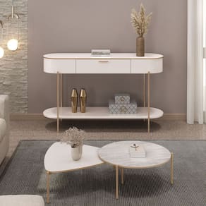 O Aparador de Sala apresenta design moderno e sofisticado, com cantos arredondados que conferem leveza ao ambiente. Seu tampo, usinado com bordas suavemente arredondadas e adornado com pintura PU dourada, valoriza cada detalhe. Equipado com uma gaveta de puxador metálico dourado, oferece organização para objetos e utensílios. A prateleira inferior, também com cantos arredondados, é ideal para exibir itens decorativos. Sua estrutura reforçada com pés metálicos dourados garante resistência, durabilidade e facilidade de limpeza, tornando-o prático e funcional. As Mesas de Centro, com design igualmente moderno e sofisticado, adicionam leveza e criam um espaço elegante e acolhedor. Uma delas possui tampo circular, enquanto a outra apresenta tampo triangular. Ambas têm bordas adornadas com pintura PU dourada, destacando o requinte. A estrutura reforçada com pés metálicos dourados assegura durabilidade e facilita a limpeza, tornando-as perfeitas para complementar a decoração da sua Sala de Estar.