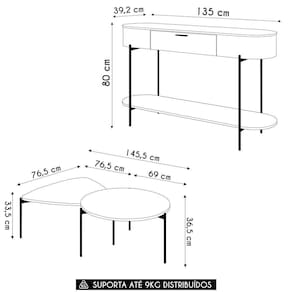 Peso Suportado Distribuídos: 5 kg Aparador/4 kg Cada Mesa.