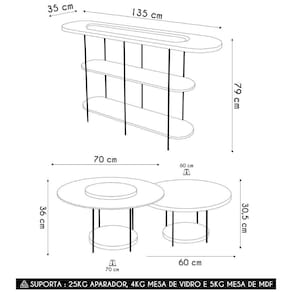 Peso Suportado Distribuído: 25 Kg Aparador / 4 Kg Mesa MDF / 5 Kg Mesa Vidro.