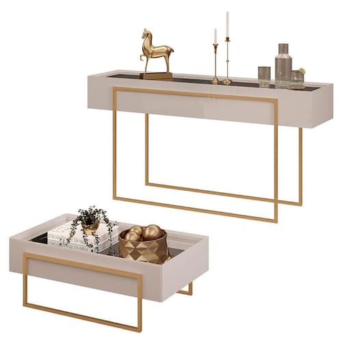 Está procurando móveis para montar sua sala? Apresentamos para você este belo conjunto composto pelo aparador e a mesa de centro da linha Petri. O aparador possui estrutura robusta e linha refinada, com laterais chanfradas valorizando o acabamento. Seu tampo com espelho aplicado entrega requinte e sofisticação. Já os pés em metal na cor dourado garantem mais estabilidade, durabilidade e elegância. A mesa de centro segue com a mesma proposta, combinando com o aparador. Com espelho aplicado sobre o tampo, bordas chanfradas e os pés em metal na cor dourado. Fabricados pela DJ Móveis, são desenvolvidos em MDP/ MDF proveniente de madeira de reflorestamento. Combinando praticidade, design e sofisticação, é perfeito para quem está buscando qualidade e sustentabilidade para elevar o estilo do seu ambiente. Confira e aproveite!