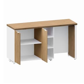 O Aparador para Frigobar F5 Office une design moderno e funcionalidade em um só móvel. Possui espaço para embutir frigobar e armário com 2 portas e prateleiras, ideal para armazenar utensílios, bebidas ou documentos. Versátil, é perfeito para escritórios, salas de reunião.