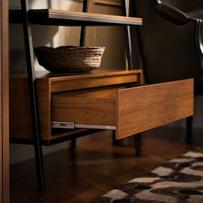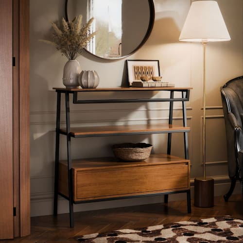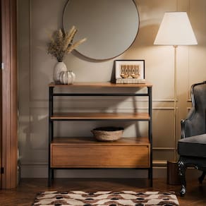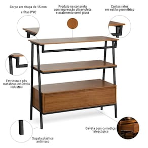 Características do Produto -Gaveta espaçosa com corrediça telescópica -Pés e estrutura em metalon no estilo industrial -Acabamento semi gloss com impressão ultravioleta -Tampo e prateleiras em chapa de 15 mm com fitas PVC -Cantos retos em estilo geométrico -Gaveta com batente dupla face, trazendo visual modern -Sapata plástica anti risco para proteger o piso -Ideal para hall de entrada, sala, escritório ou corredor