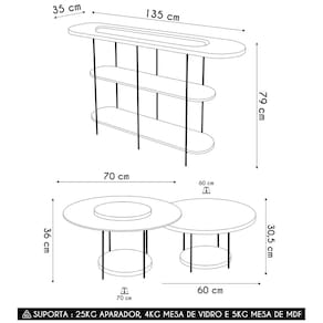Peso Suportado Distribuído: 25 Kg Aparador / 4 Kg Mesa MDF / 5 Kg Mesa Vidro.